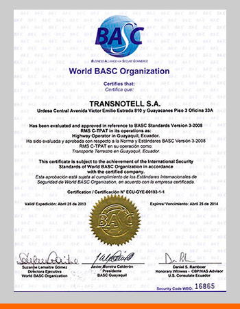 Transnotell S.A. cuenta con la certificación BASC, y dos auditores internos certificados dentro de la compañía. Estamos en an´lisis de la implementación de una nueva certificación como la ISO.